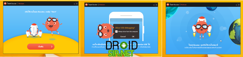 - ทำการเปิดโปรแกรมเพื่อใช้งาน ตามลำดับจากซ้ายไปขวา ในส่วนของภาพที่สองจากซ้ายจะต้องทำร่วมกับมือถือที่ใช้งานด้วย เมื่อเป็นภาพทางขวาก็เริ่มใช้งานได้
