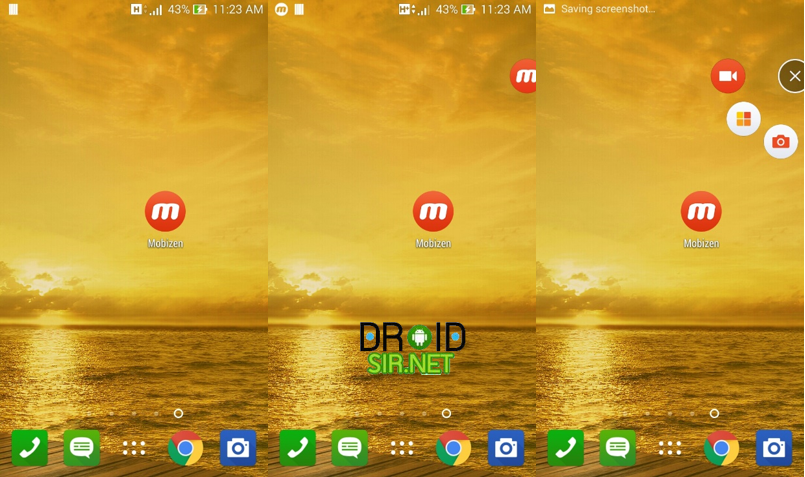 - อธิบายภาพจาก ซ้ายมาขวา ตามลำดับ เมื่อติดตั้งสำเร็จจะมีได้ไอคอน Mobizen ขึ้นมา เมื่อกดที่ตัวแอพพลิเคชั่นก็จะมีไอคอนเล็กเกิดขึ้น เมื่อไปคลิ๊กที่ตัวไอคอนเล็กๆนั้นก็จะมีให้เราเลือกคือ อัดวิดีโอ ถ่ายภาพหน้าจอ และ เมนูต่างๆ ดังภาพด้านตามลำดับ