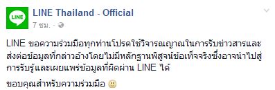 โดยทางแฟนเพจเฟซบุ๊ค LINE Thailand – Official ได้ทำการโพสเพื่อขอความร่วมมือกับการรับข่าวสาร ที่ไม่มีหลักฐานพิสูจน์ว่าเป็นข้อเท็จจริง เพื่อไม่ให้เกิดความสับสนของคนทุกคนที่ได้รับข้อมูลที่ไม่เป็นความจริง